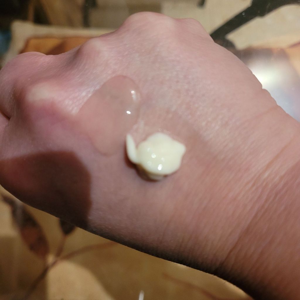 La redondita del tamaño de un garbanzo es la cantidad normal de (mi) serum habitual, mientras que la translúcida es el Adds Glow.